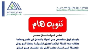 أعلنت شركة غاز مصر إحدى شركات قطاع البترول، عن قيام فريق متخصص من الشركة بالتعامل في تطهير ومعالجة مخلفات مادة إضافة الرائحة بمخازن الشركة بمنطقة أبو رواش بالإضافة إلى إسناد عملية نقل تلك المخلفات من خلال شركة متخصصة فى النقل والتخلص الآمن للمخلفات وذلك يوم الخميس الموافق 30 نوفمبر 2023 بدءاً من الساعة 12 مساء ولمدة 3 ساعات حيث تكون معظم المناطق المجاورة شبه خاليه، (المنطقة الصناعية، القرية الذكية ).