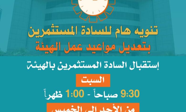 وأشارت إلي أن مواعيد استقبال المستثمرين كالآتى تبدأ من يوم السبت من الـ9:30 صباحًا وحتى الـ1 ظهرًا ومن الأحد إلى الخميس من 8:30 صباحًا وحتى الـ3 عصرًا ويسري القرار على جميع مقرات الهيئة.