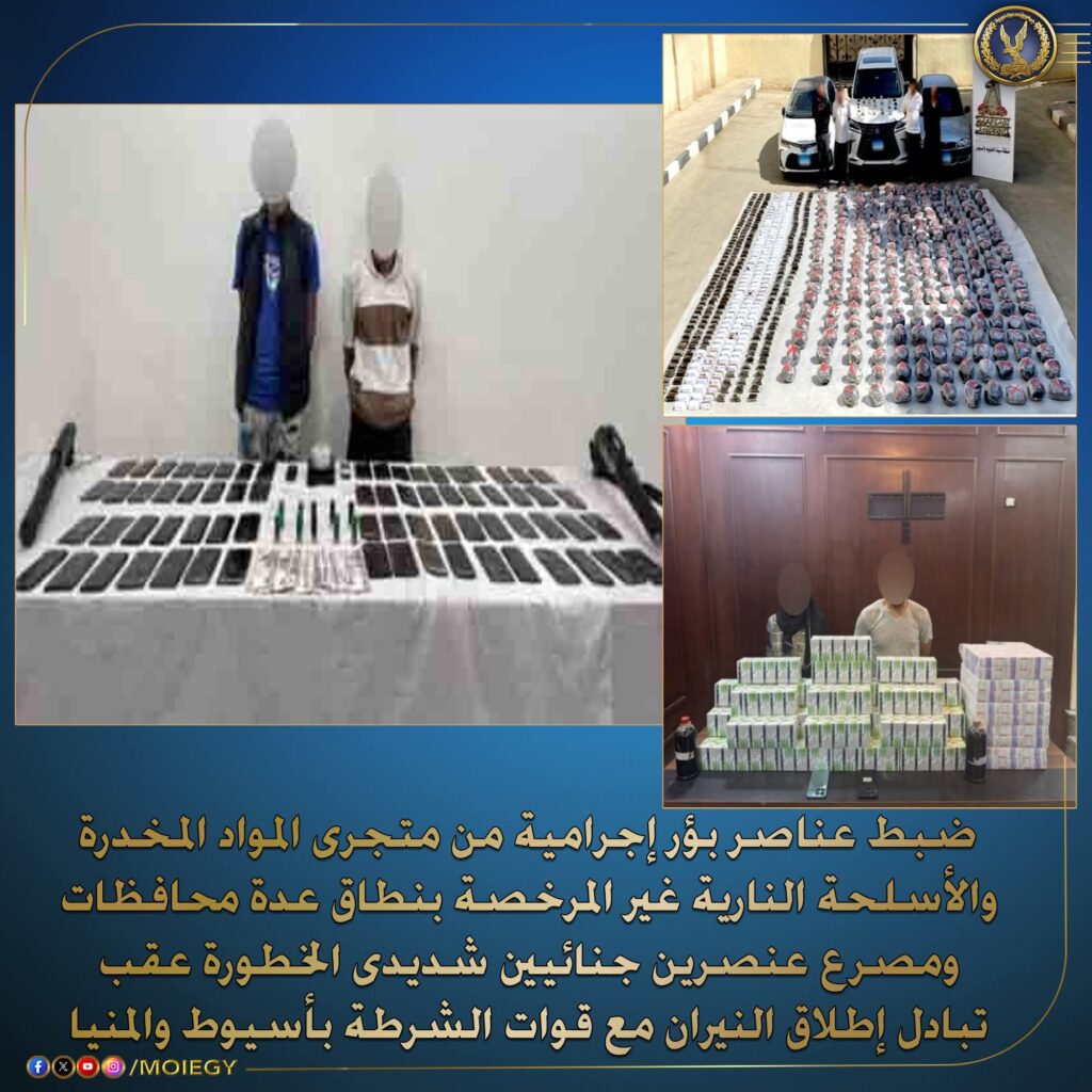 أكدت معلومات وتحريات قطاعى “الأمن العام – مكافحة المخدرات والأسلحة والذخائر غير المرخصة” بالتنسيق مع أجهزة الوزارة المعنية قيام بؤر إجرامية بنطاق عدة محافظات تضم (عناصر جنائية شديدة الخطورة) بمحاولة جلب كميات من المواد المخدرة والأسلحة النارية غير المرخصة تمهيداً للإتجار بها .