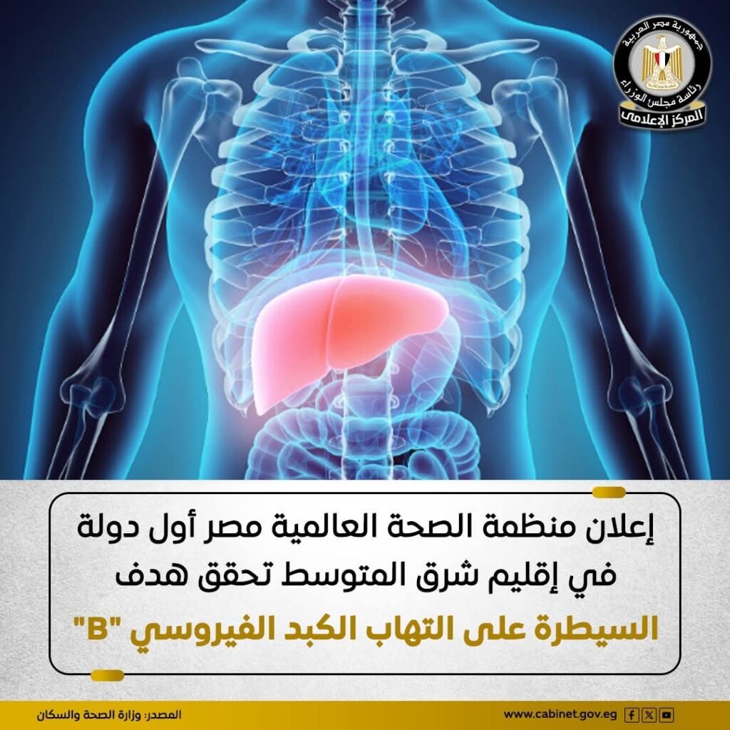 إعلان منظمة الصحة العالمية مصر أول دولة في إقليم شرق المتوسط تحقق هدف السيطرة على التهاب الكبد الفيروسي “B”.