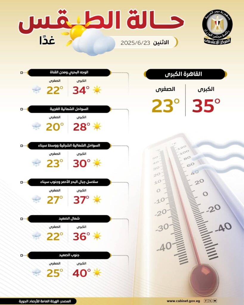 طقس غدًا، الإثنين (23 يونيو 2025)، تشهد القاهرة أجواء معتدلة النسيم وأقل رطوبة مقارنة باليوم السابق، مع درجات حرارة تتراوح ما بين 23°C ليلاً و35°C نهارًا. الشمس ستكون مشعة جزئيًا.