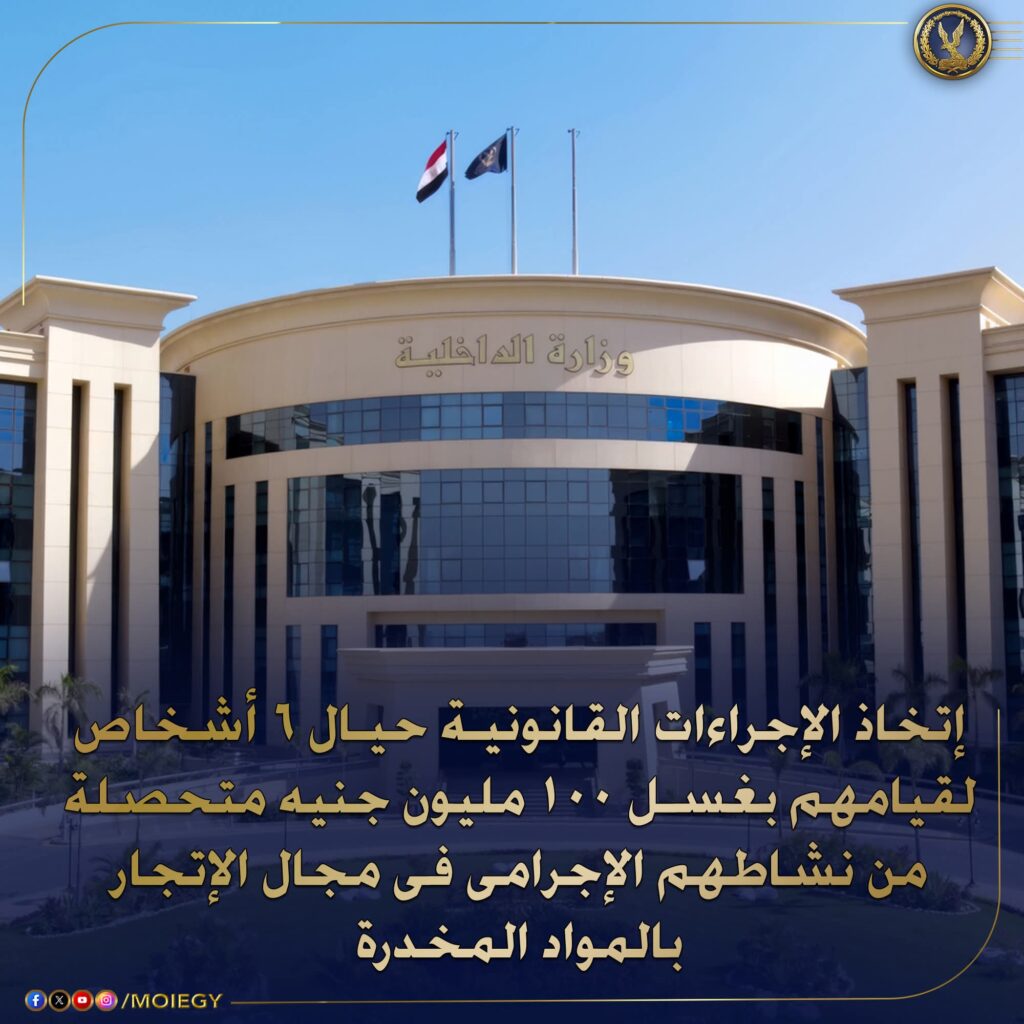 إتخاذ الإجراءات القانونية حيال ٦ أشخاص لقيامهم بغسل ١٠٠ مليون جنية متحصلة من نشاطهم الإجرامي في مجال الإتجار بالمولد المخدرة.