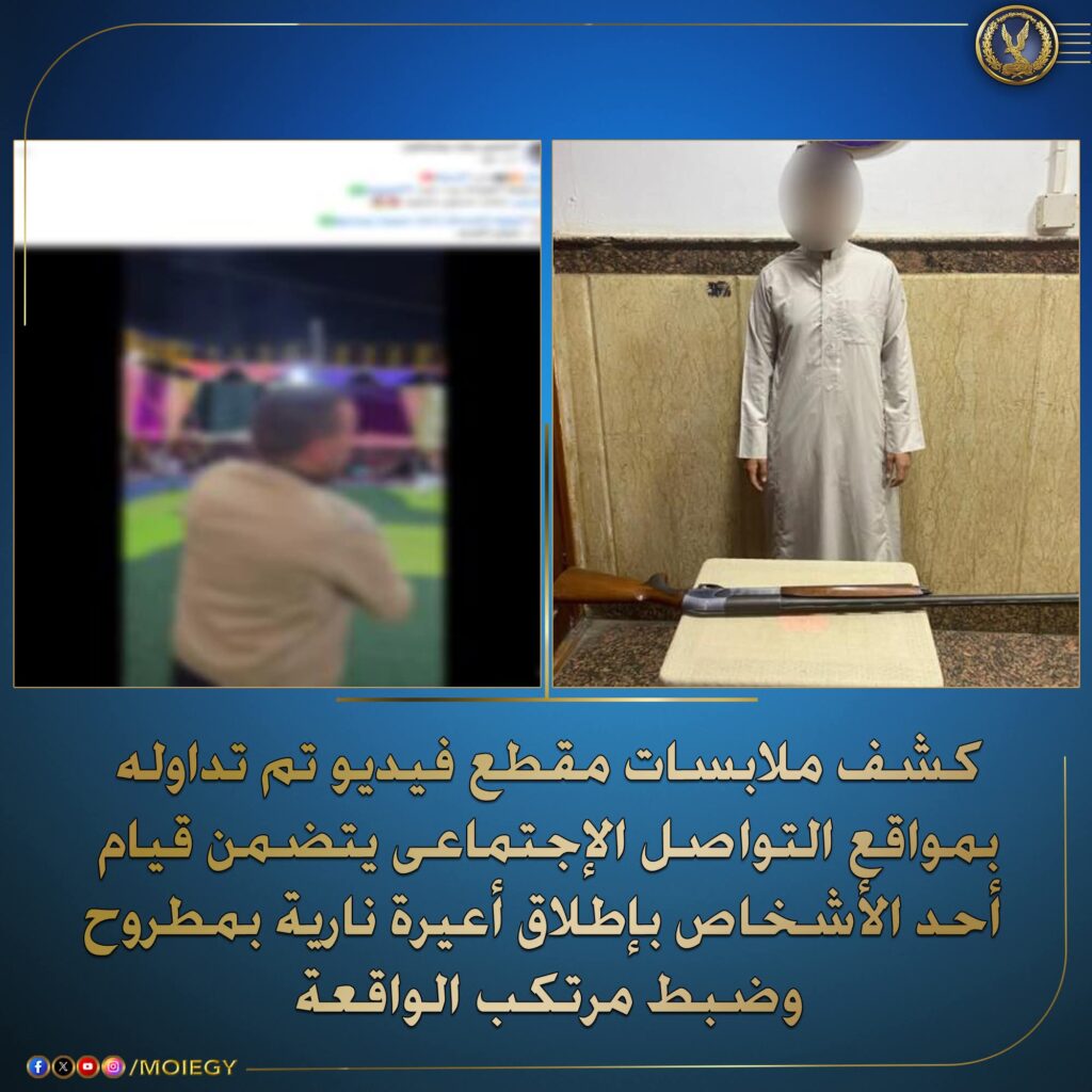 بالفحص أمكن تحديد وضبط الشخص الظاهر بمقطع الفيديو (عامل – مقيم بمحافظة #مطروح) وبحوزته السلاح المستخدم فى إرتكاب الواقعة، وبمواجهته أقر بقيامه بذلك خلال حفل زفاف أحد أقاربه.