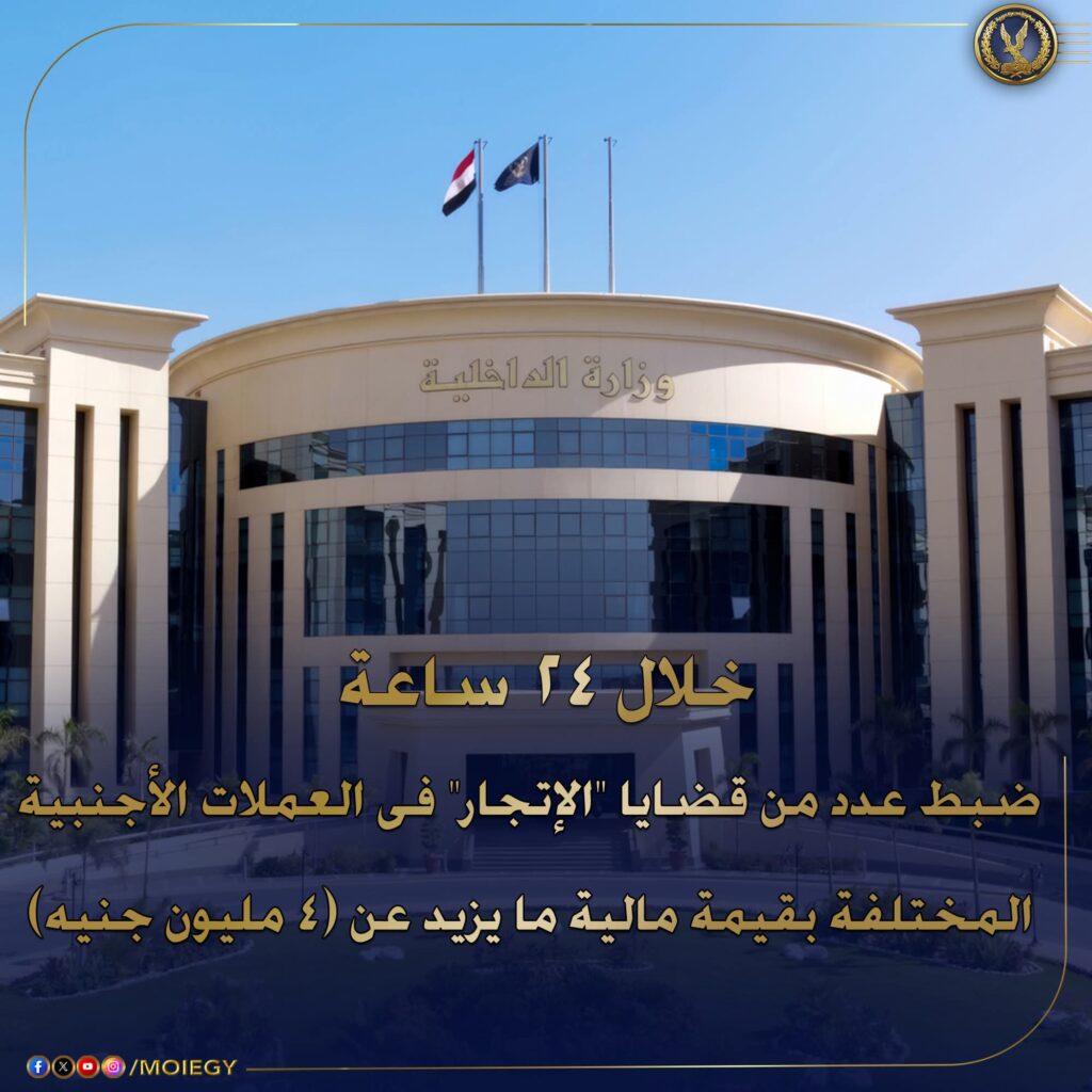 خلال ٢٤ ساعة ضبط عدد من قضايا “الإتجار “في العملات الأجنبية المختلفة بقيمة مالية ما يزيد عن(٤)مليون جنيه.