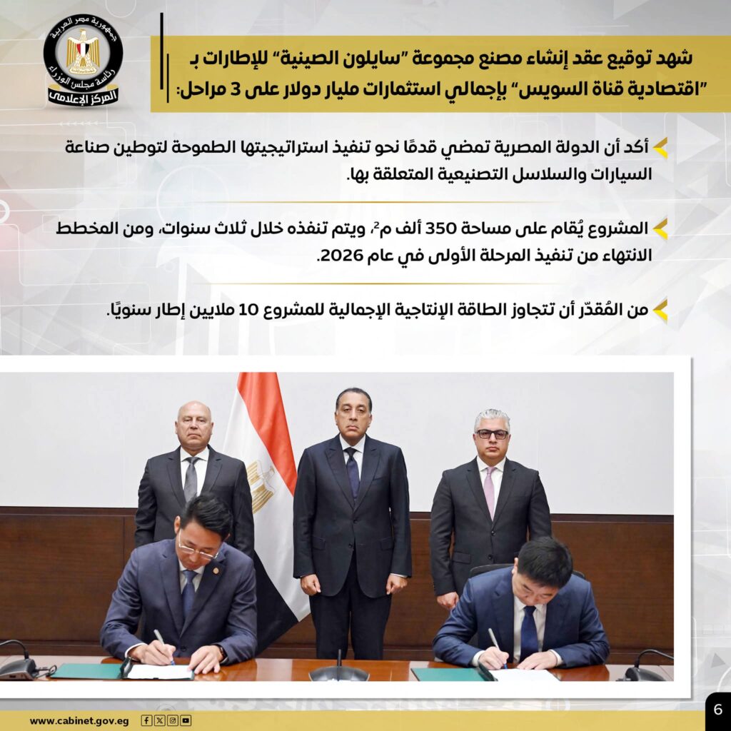 – باستثمارات مليار دولار توقيع عقد إنشاء مصنع للإطارات بـ”اقتصادية قناة السويس”