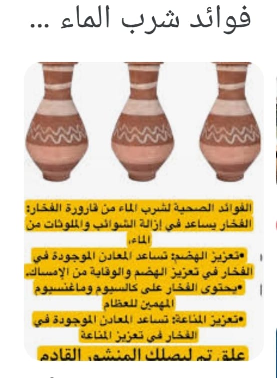 🔵وننصح بأن يخصص لكل فرد قله فخار او بتفريغ الماء منها ويصب فى كوب فخار او زجاج اذا اشترك أكثر من شخص فى قله واحده وياحباذا لو وجد زير فخار كبير ويؤخذ منه على قدر المطلوب للشرب . 🟢الخلاصه .الله عز وجل خلق الإنسان من طين ، والطين افضل مادة لحفظ الحياة والطاقة