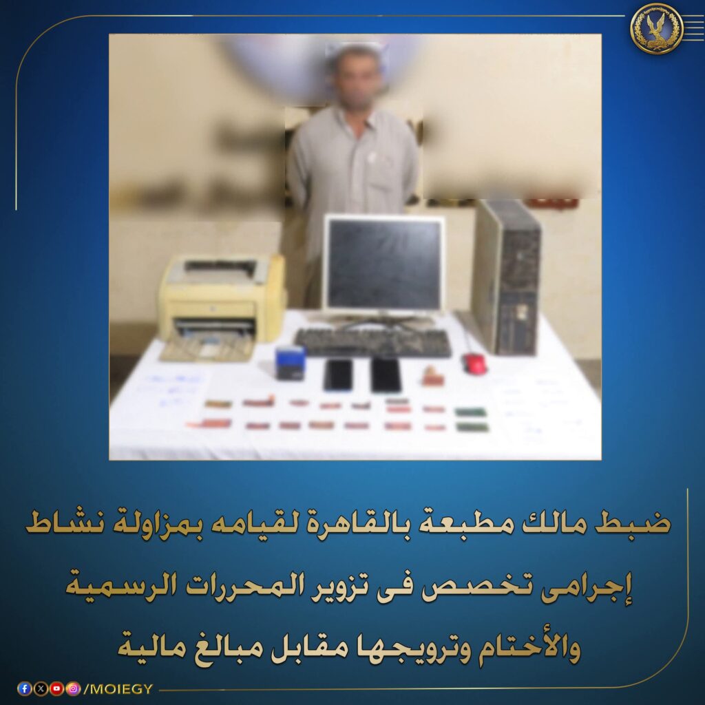 ضبط مطبعة غير مرخصة متورطة في التزوير وتقليد الأختام بالقاهرة.