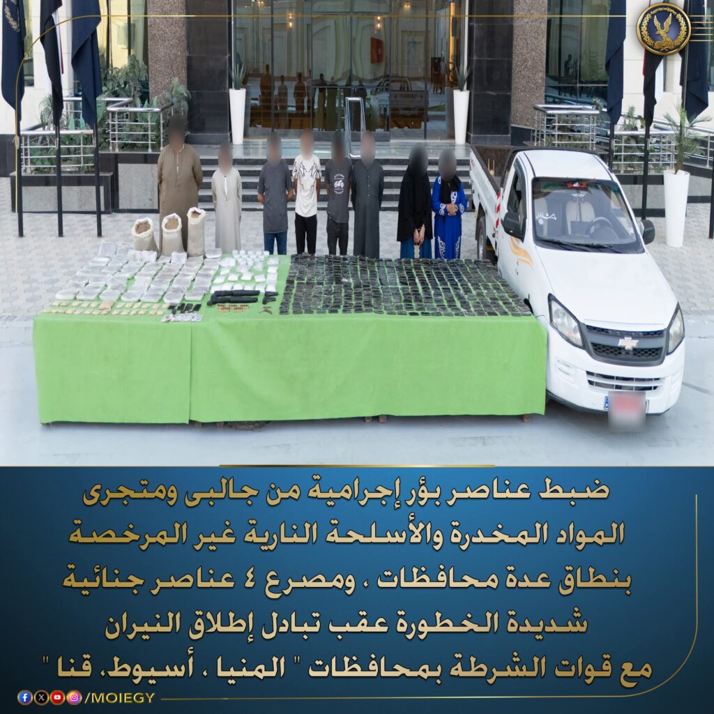 وعقب تقنين الإجراءات، جرى تتبع العناصر الإجرامية واستهدافها بالتنسيق مع قطاع الأمن المركزي، ما أسفر عن مصرع 4 من العناصر شديدة الخطورة – محكوم عليهم بالسجن المؤبد وأحكام جنائية في قضايا قتل وشروع في قتل ومخدرات وسرقة بالإكراه وسلاح ناري – بنطاق محافظات المنيا وأسيوط وقنا.