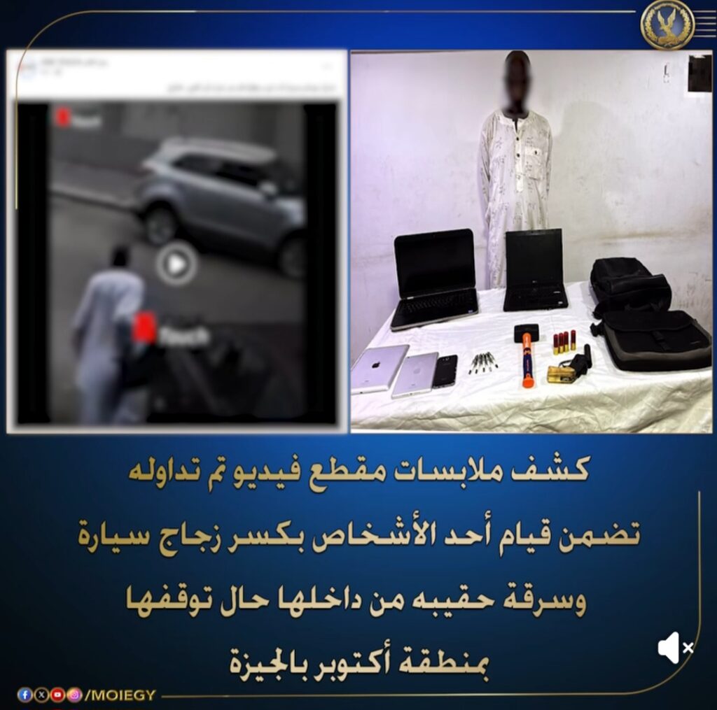 كشفت أجهزة وزارة الداخلية ملابسات مقطع فيديو تم تداوله عبر مواقع التواصل الاجتماعي، أظهر قيام أحد الأشخاص بكسر زجاج سيارة وسرقة حقيبة من داخلها أثناء توقفها بمنطقة أكتوبر بالجيزة.