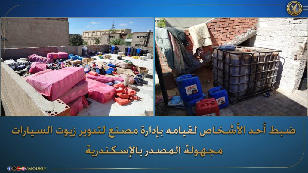 الداخلية تضبط أحد الأشخاص لقيامه بإدارة مصنع لتدوير زيوت السيارات مجهولة المصدر بالإسكندرية.