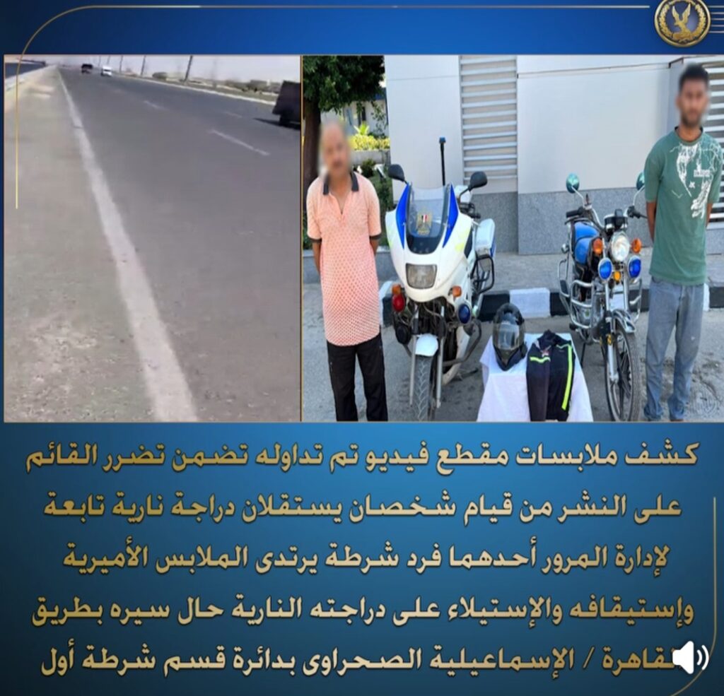 كشفت أجهزة وزارة الداخلية ملابسات تداول مقطع فيديو على مواقع التواصل الاجتماعي يظهر خلاله أحد المواطنين متضررًا من قيام شخصين يستقلان دراجة نارية شبيهة بدراجات المرور، أحدهما يرتدي ملابس resembling الزي الشرطي، باستيقافه والاستيلاء على دراجته النارية بطريق القاهرة/الإسماعيلية الصحراوي بدائرة قسم شرطة أول العاشر من رمضان بالشرقية.