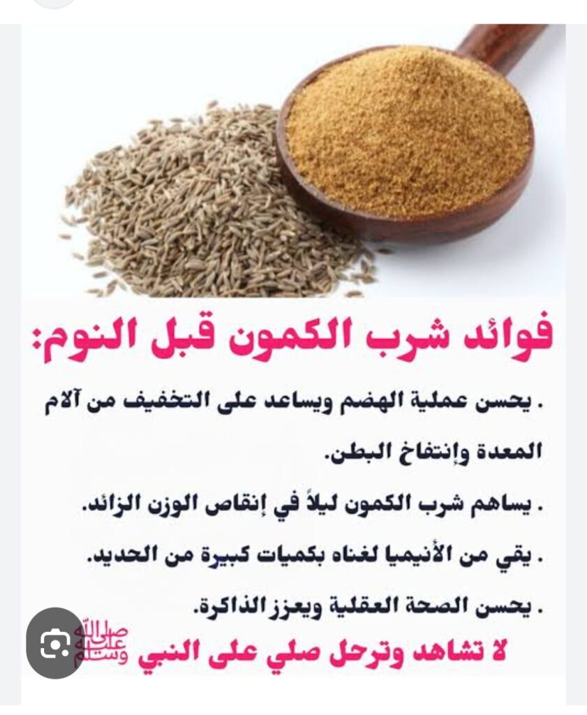 بفضل خصائصه المهدئة، يمكن لكوب من الكمون قبل النوم أن يُخفف من التوتر العصبي والقلق، مما ينعكس إيجابيًا على صحتك النفسية والجسدية. واسأل الله ان يجعل يومكم مشرق وانتم بكامل الصحه وموفور العافيه ودمتم سالمين ودمتم بحفظ الله ورعايته