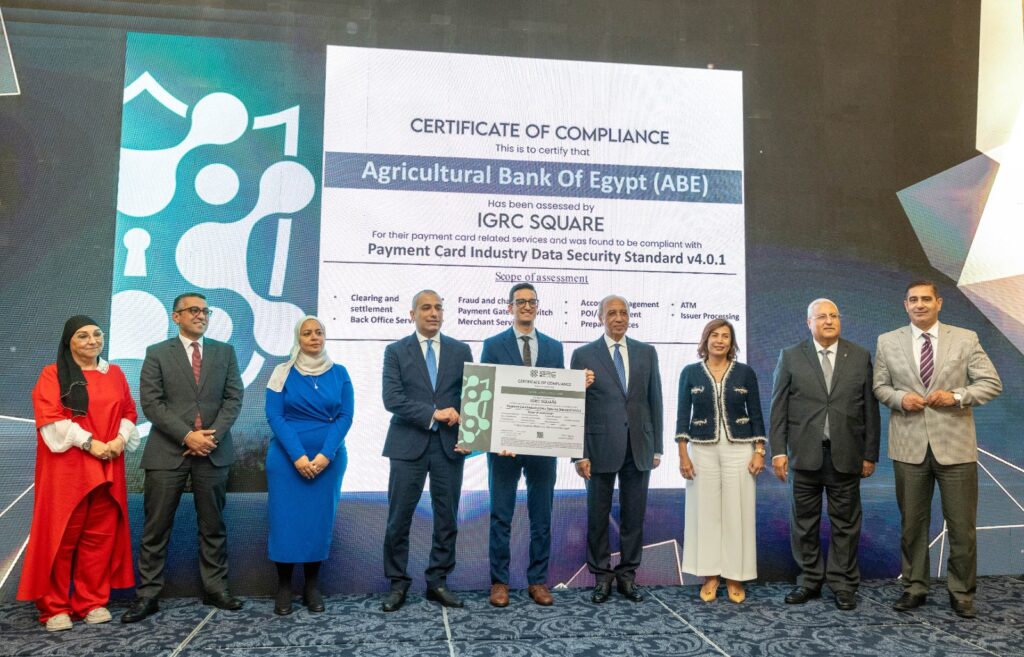 في أمسية رائعة تغمرها مشاعر الفخر والسعادة، احتفل البنك الزراعي المصري بتحقيق إنجازين في ليلة واحدة، الإنجاز الأول بحصوله على شهادة التوافق مع المعايير الدولية لأمن المعلومات وصناعة بطاقات الدفع (PCI-DSS) بأحدث إصداراتها V4.0.1))، والتي يتم منحها للبنوك التي تطبق أعلى المعايير الأمنية العالمية لحماية بيانات بطاقات الدفع الإلكترونية، كما احتفل البنك بحصول المجموعة القانونية على شهادة الأيزو ISO-9001، تأكيداً على التزام مجموعة الشئون القانونية بتطبيق أعلى معايير الجودة في أداءها المهني.