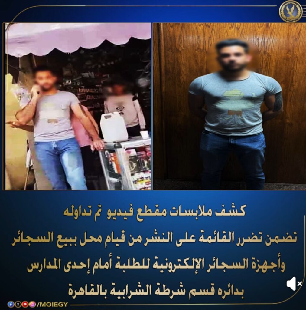 في إطار جهود وزارة الداخلية لمواجهة الشائعات وكشف ملابسات ما يتم تداوله عبر مواقع التواصل الاجتماعي، رصدت الأجهزة الأمنية مقطع فيديو نشرته إحدى الصفحات تضمن شكوى من قيام محل ببيع السجائر وأجهزة السجائر الإلكترونية للطلاب أمام إحدى المدارس بدائرة قسم شرطة الشرابية بالقاهرة.