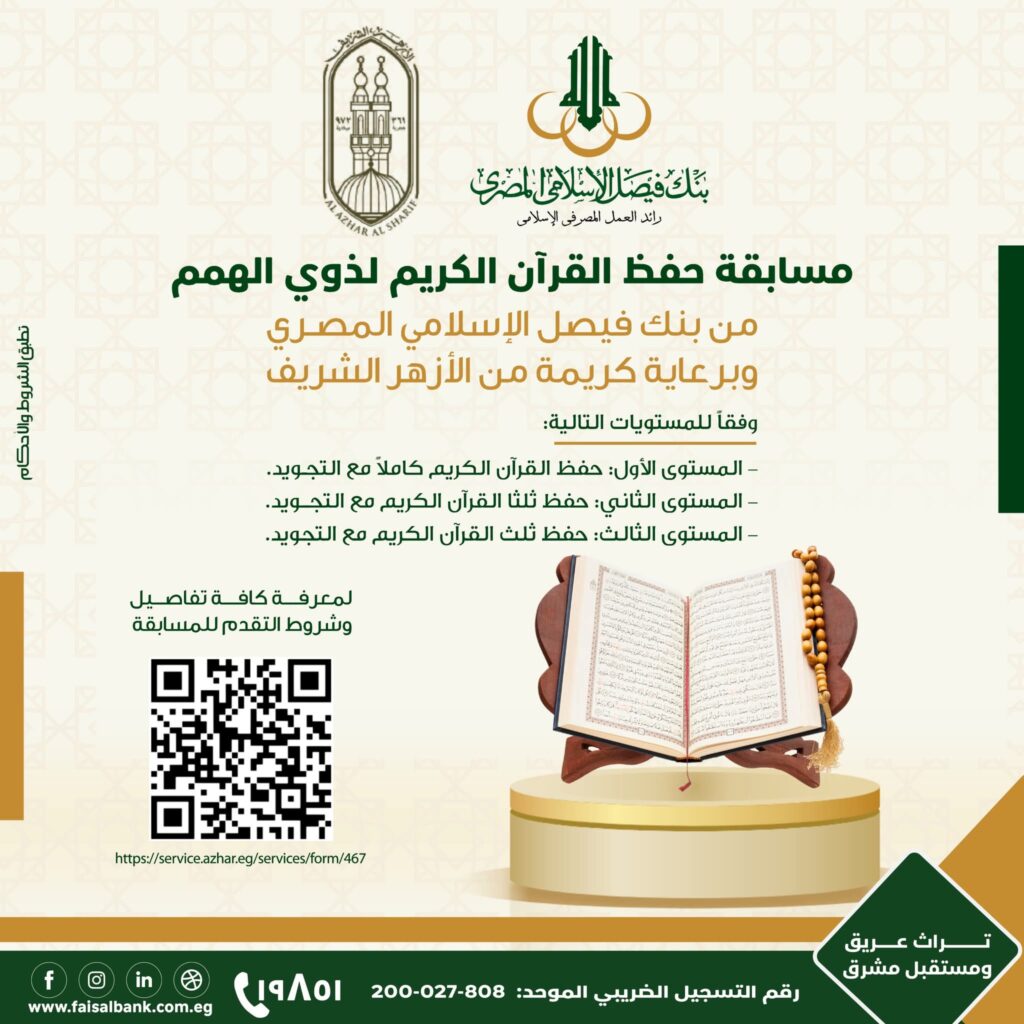 بنك فيصل الإسلامي المصري يطلق مسابقة لحفظ وتجويد القرآن الكريم لذوي الهمم برعاية الأزهر الشريف.