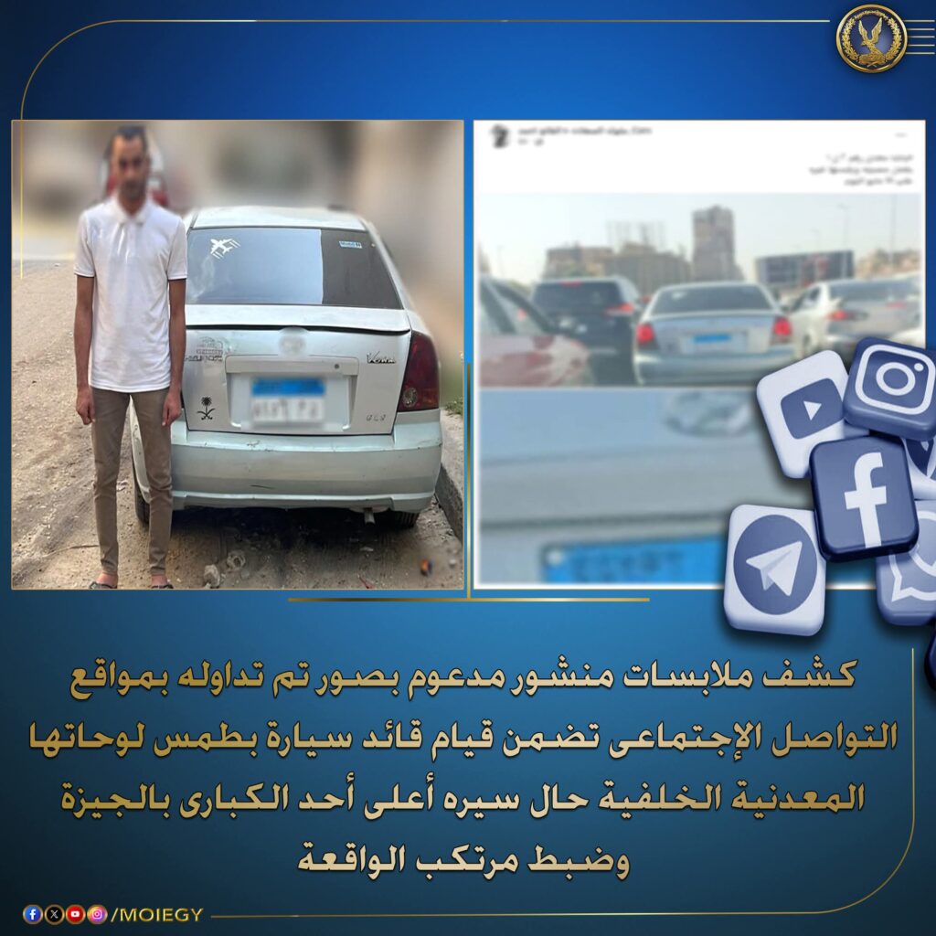 في إطار جهود وزارة الداخلية لملاحقة المخالفات المرورية وكشف ملابسات ما يتم تداوله عبر مواقع التواصل الاجتماعي، رصدت الأجهزة الأمنية منشورًا مدعومًا بصور يُظهر قائد سيارة يقوم بطمس اللوحات المعدنية الخلفية أثناء سيره أعلى أحد الكباري بمحافظة الجيزة.