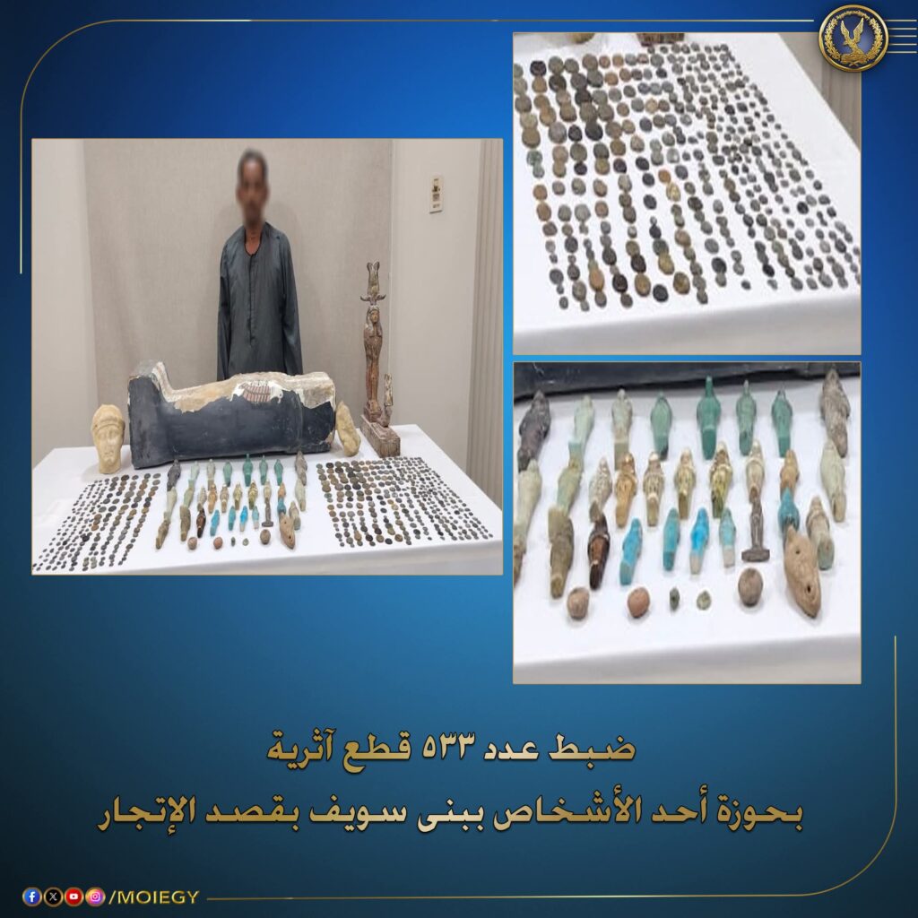 وعقب تقنين الإجراءات، تم ضبط المتهم، وعُثر بحوزته على 533 قطعة أثرية متنوعة (تماثيل – تمائم – عملات معدنية).