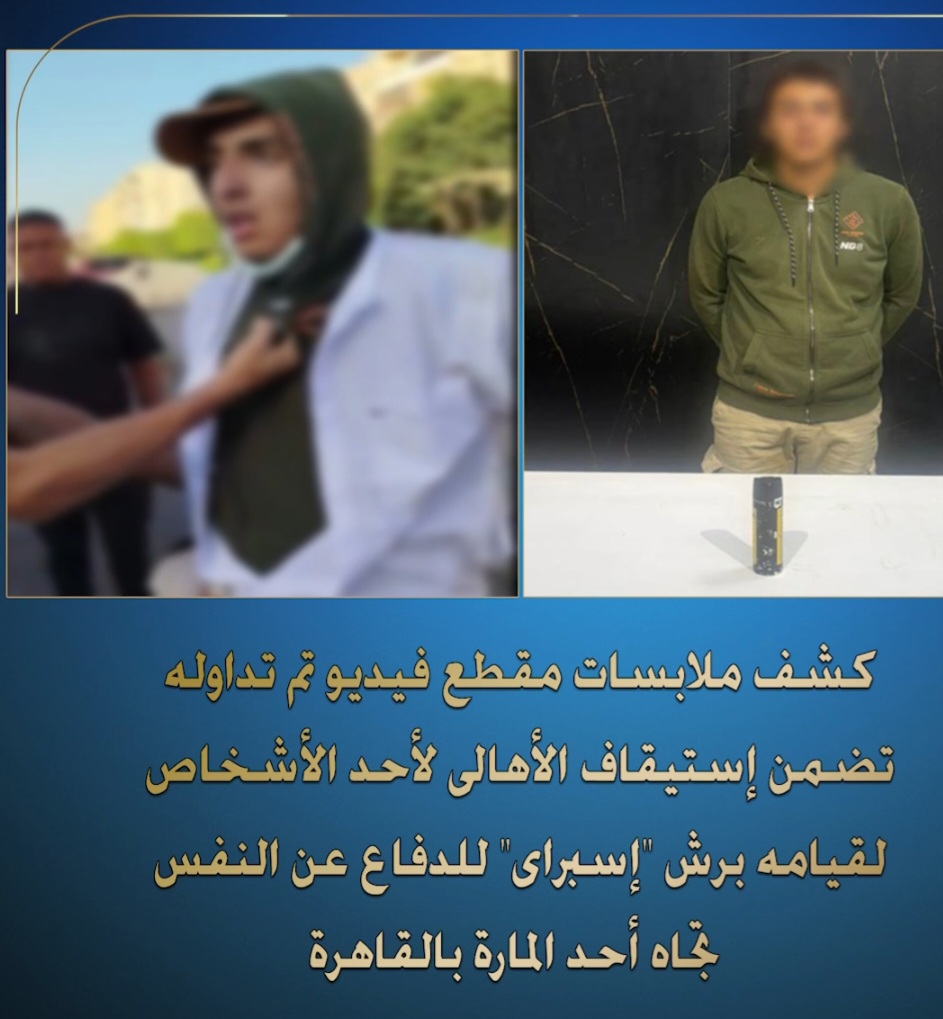 كشف ملابسات مقطع فيديو متداول على مواقع التواصل الاجتماعي باستيقاف أحد الأشخاص لقيامه برش “إسبراى” للدفاع عن النفس تجاه أحد المارة بالقاهرة.