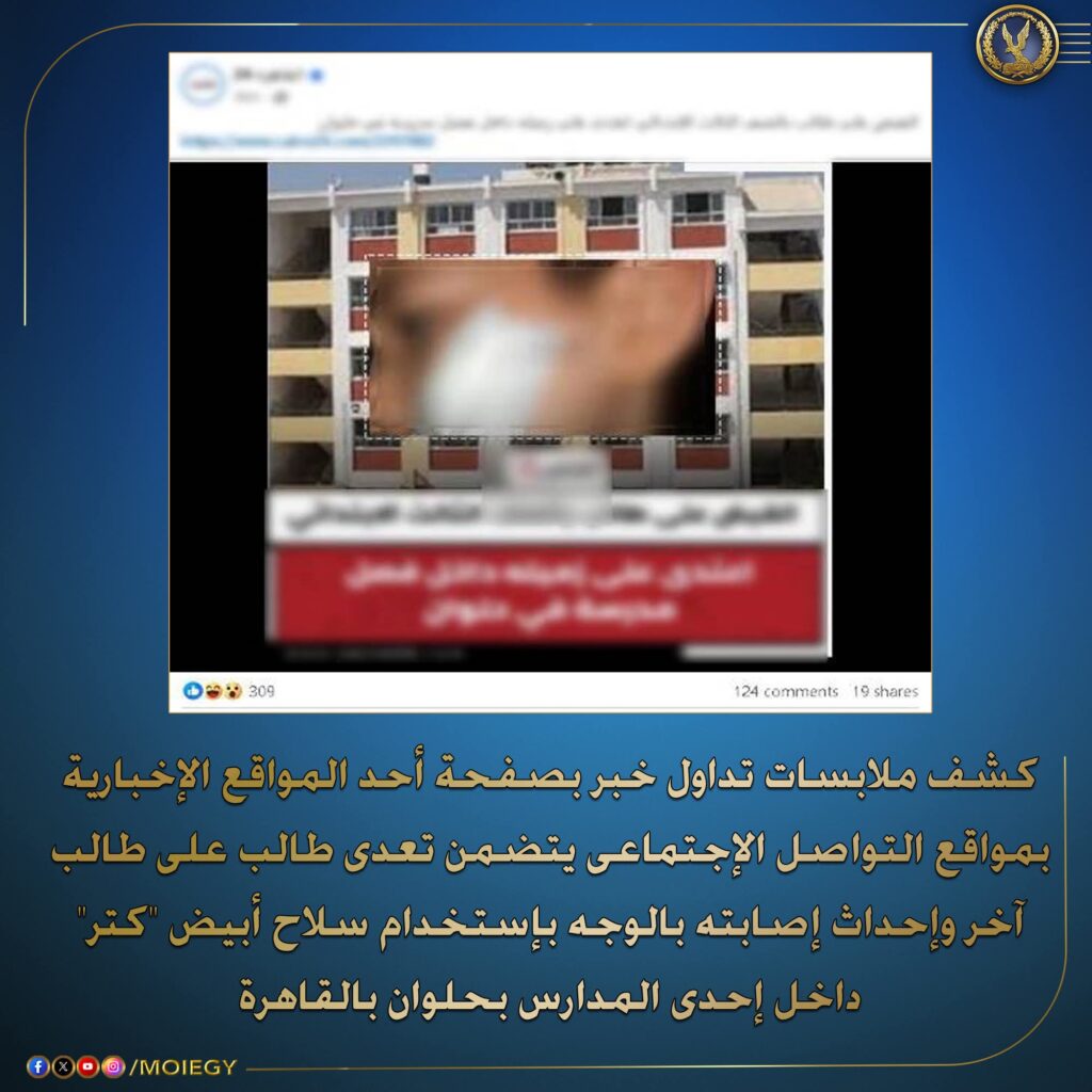 فى إطار جهود وزارة الداخلية لكشف ملابسات ما يتم تداوله عبر مواقع التواصل الاجتماعى، فقد رصدت الأجهزة الأمنية خبرًا نُشر على إحدى الصفحات الإخبارية يتضمن تعدى طالب على آخر باستخدام سلاح أبيض “كتر” داخل إحدى المدارس بحلوان بالقاهرة.