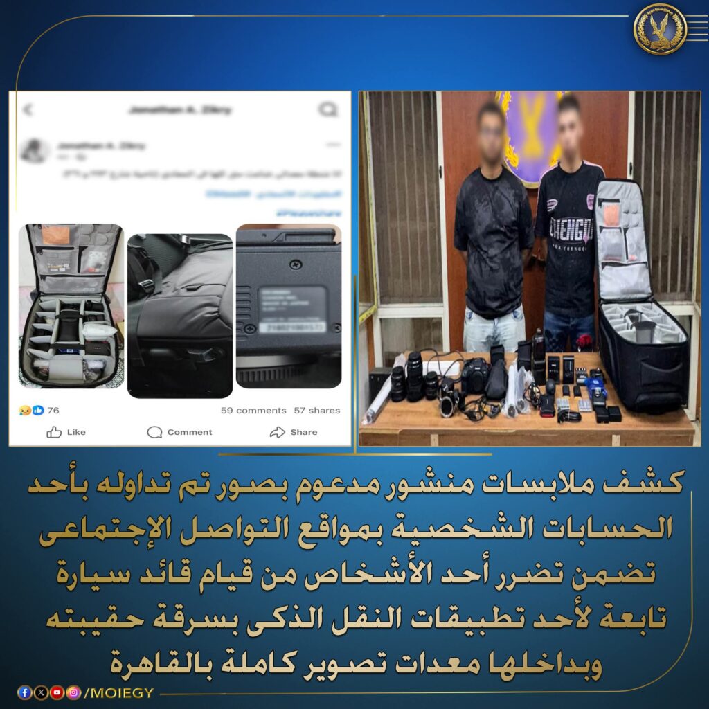 في إطار الجهود المستمرة لوزارة الداخلية في تتبّع ما يُنشر عبر مواقع التواصل الاجتماعي، لكشف الحقائق والرد على الشائعات، تمكنت الأجهزة الأمنية من كشف ملابسات منشور تضمن شكوى أحد المواطنين من تعرضه لسرقة حقيبته التي تحتوي على معدات تصوير كاملة بالقاهرة.
