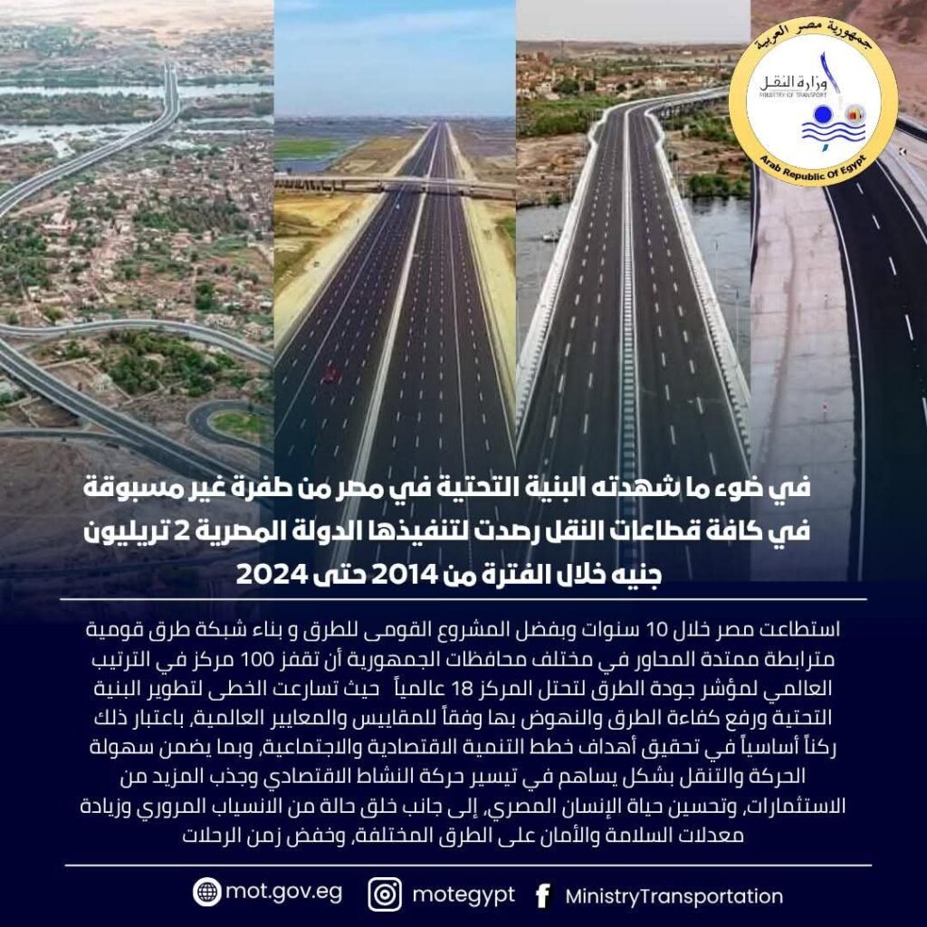 في إطار رؤية مصر 2030 واستراتيجية الدولة لتحقيق التنمية المستدامة، تواصل مصر جني ثمار ما تم إنجازه من مشروعات كبرى في البنية التحتية وقطاع النقل، والتي رصدت لها الدولة استثمارات تجاوزت 2 تريليون جنيه خلال الفترة من 2014 حتى 2024، لتشكل دعامة رئيسية للنمو الاقتصادي الشامل وجذب الاستثمارات المحلية والأجنبية.