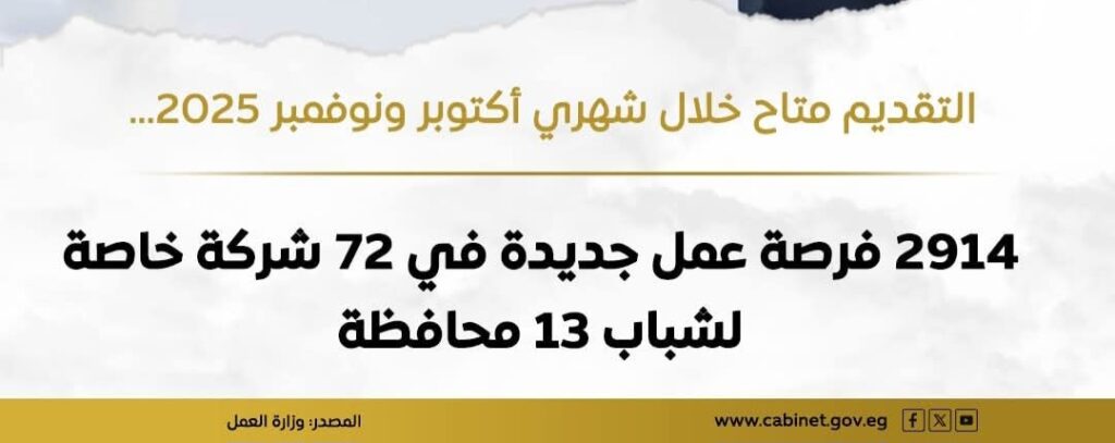 📍 التقديم متاح خلال شهري أكتوبر ونوفمبر 2025، من خلال مكتب الإدارة العامة للتشغيل بمقر وزارة العمل القديم في مدينة نصر، أو عبر مديريات العمل بالمحافظات، وكذلك عبر الموقع الرسمي للوزارة على شبكة الإنترنت، أو من خلال أرقام وعناوين الشركات المرفقة في الرابط التالي والذي يتضمن التخصصات المطلوبة كذلك: