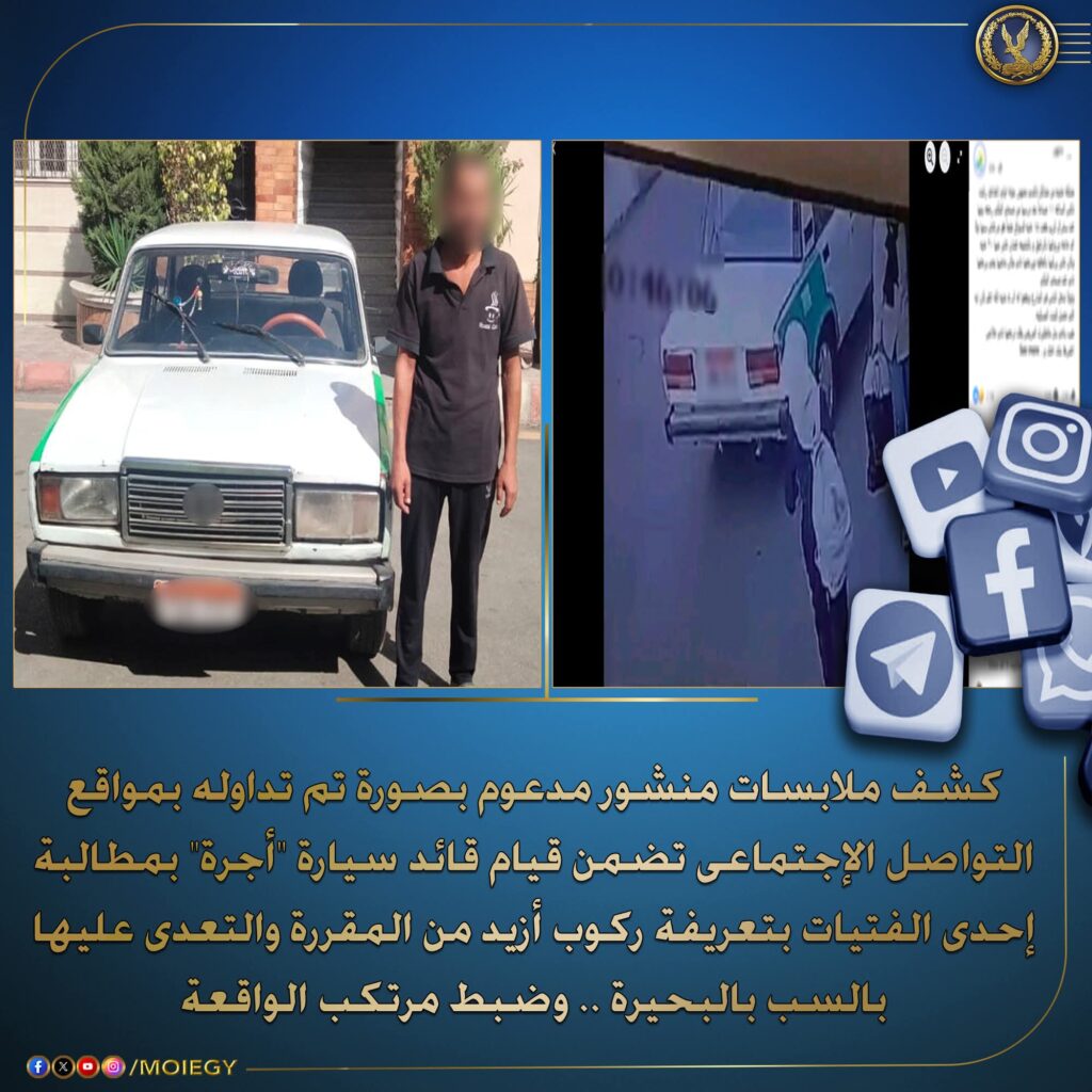 في إطار جهود وزارة الداخلية لكشف ملابسات ما تم تداوله على مواقع التواصل الاجتماعي، بشأن منشور مدعوم بصورة تضمن قيام قائد سيارة “أجرة” بمطالبة إحدى الفتيات بتعريفة ركوب أزيد من المقررة والتعدي عليها بالسب بمحافظة البحيرة، نجحت الأجهزة الأمنية في تحديد وضبط مرتكب الواقعة.