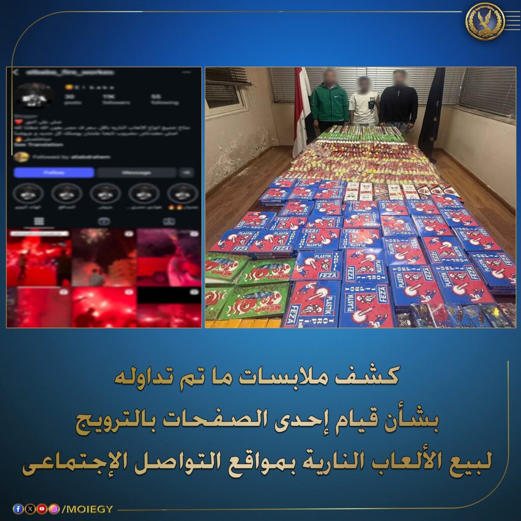 وبالفحص، تمكنت الإدارة العامة لتكنولوجيا المعلومات من تحديد وضبط القائمين على الصفحة، وتبين أنهم 3 عاطلين مقيمون بمحافظة القليوبية، وعُثر بحوزتهم على أكثر من 13 ألف قطعة ألعاب نارية متنوعة الأحجام والأشكال.