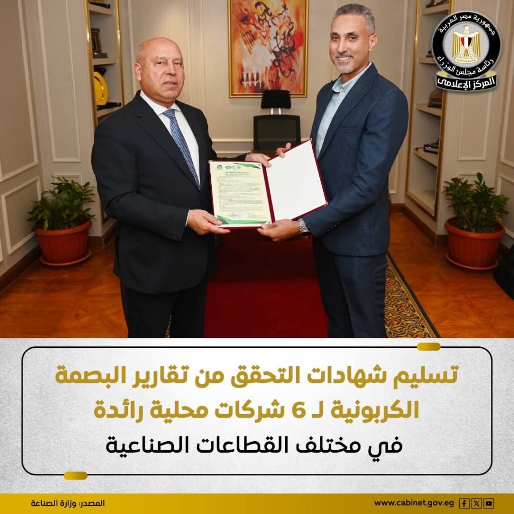 في إطار توجه الدولة نحو دعم التحول للاقتصاد الأخضر وتعزيز الاستدامة في القطاع الصناعي، وتحقيق مستهدفات “رؤية مصر 2030″، تم تسليم شهادات التحقق من البصمة الكربونية لعدد من الشركات الصناعية الرائدة.