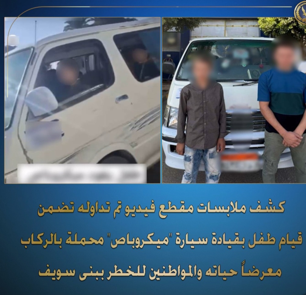 في إطار جهود وزارة الداخلية لكشف ملابسات ما تم تداوله على مواقع التواصل الاجتماعي من مقطع فيديو يظهر خلاله طفل يقود سيارة “ميكروباص” محملة بالركاب معرضًا حياته وحياة المواطنين للخطر بمحافظة بني سويف.