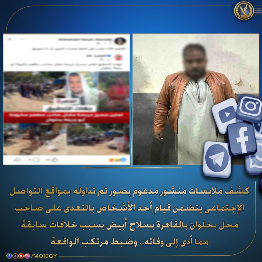كشفت وزارة الداخلية ملابسات واقعة مقتل صاحب محل في منطقة حلوان بمحافظة القاهرة، بعد تداول منشور مدعوم بصور على مواقع التواصل الاجتماعي يُظهر تعدي أحد الأشخاص عليه بسلاح أبيض، ما أسفر عن وفاته.
