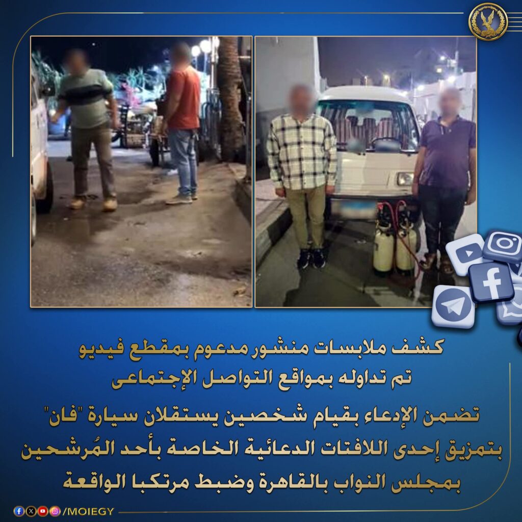 في إطار جهود وزارة الداخلية لكشف ملابسات ما يُتداول عبر مواقع التواصل الاجتماعي، تم فحص منشور مدعوم بمقطع فيديو يزعم قيام شخصين يستقلان سيارة «فان» بتمزيق لافتة دعائية لأحد المرشحين لمجلس النواب بالقاهرة.