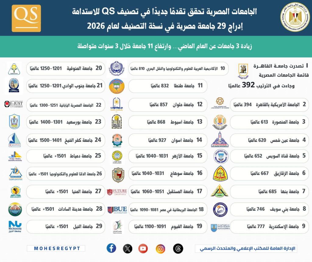 أعلنت وزارة التعليم العالي والبحث العلمي تحقيق الجامعات المصرية تقدمًا جديدًا في تصنيف QS العالمي للاستدامة 2026، بعدما ارتفع عدد الجامعات المصرية المُدرجة إلى 29 جامعة، بزيادة ثلاث جامعات عن العام الماضي، واستكمالًا لمسار تصاعدي بدأ بـ18 جامعة فقط في نسخة 2024، ثم 26 جامعة في نسخة 2025.