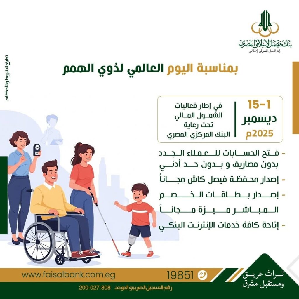 احتفالًا بـ اليوم العالمي لذوي الهمم، وضمن مبادرات الشمول المالي برعاية البنك المركزي المصري، يقدّم بنك فيصل الإسلامي المصري مجموعة من الخدمات البنكية مجانيًا دون أي مصاريف إدارية خلال الفترة من 1 إلى 15 ديسمبر 2025، وذلك دعمًا لتعزيز مشاركة ذوي الهمم في التعاملات المالية وتمكينهم من الاستفادة من الخدمات المصرفية بسهولة ويسر.