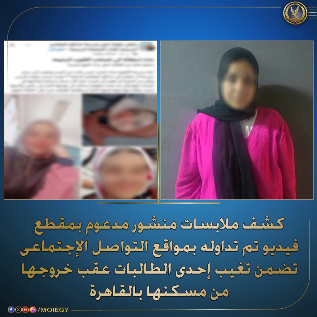 في إطار جهود وزارة الداخلية لكشف ملابسات ما تم تداوله على مواقع التواصل الاجتماعي بشأن منشور مُرفق بمقطع فيديو يتضمن تغيب إحدى الطالبات عقب خروجها من مسكنها بالقاهرة.