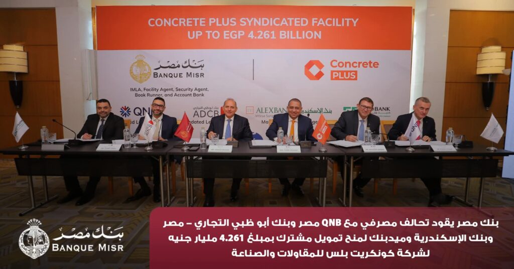 بنك مصر يقود تحالف مصرفي مع QNB مصر وبنك أبو ظبي التجاري- مصر و بنك الإسكندرية و ميدبنك لمنح تمويل مشترك بمبلغ 4.261 مليار جنيه لشركة كونكريت بلس للمقاولات و الصناعة.