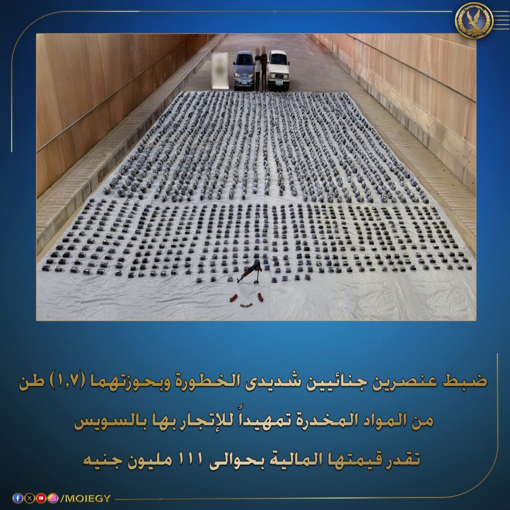 في إطار مواصلة جهود وزارة الداخلية لمكافحة جرائم جلب المواد المخدرة وملاحقة العناصر الإجرامية المتورطة في ترويجها، أكدت معلومات وتحريات قطاع مكافحة المخدرات والأسلحة والذخائر غير المرخصة، بالتنسيق مع الجهات المعنية بالوزارة، قيام عنصرين جنائيين شديدي الخطورة بجلب كميات ضخمة من المواد المخدرة تمهيدًا للاتجار بها.