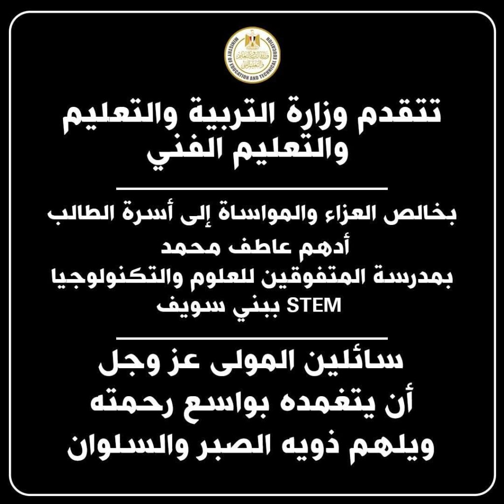 أعربت وزارة التربية والتعليم والتعليم الفني عن خالص تعازيها لأسرة الطالب أدهم عاطف محمد بمدرسة المتفوقين للعلوم والتكنولوجيا STEM ببني سويف، والذي وافته المنية أمس إثر إصابته بوعكة صحية، داعيةً المولى عز وجل أن يتغمده بواسع رحمته ويلهم أسرته الصبر والسلوان.