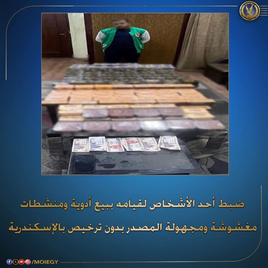 إستمراراً لجهود أجهزة وزارة الداخلية لمكافحة جرائم ترويج المنشطات مجهولة المصدر وغير المصرح بتداولها .. فقد أكدت معلومات وتحريات الإدارة العامة لحماية الآداب بقطاع الشرطة المتخصصة قيام (أحد الأشخاص) ببيع أدوية ومنشطات مغشوشة ومجهولة المصدر بدون ترخيص بالإسكندرية.