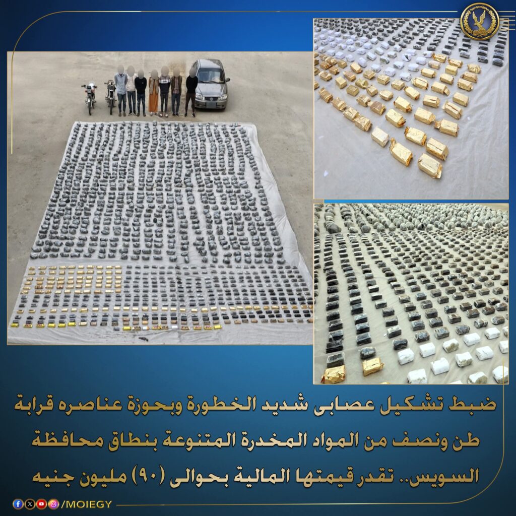 وعقب تقنين الإجراءات، جرى تتبع عناصر التشكيل وإعداد الأكمنة اللازمة، وأسفرت الجهود عن ضبطهم بنطاق محافظة السويس، وبحوزتهم قرابة طن ونصف من المواد المخدرة المتنوعة، شملت مخدري «الهيدرو» و«الحشيش».