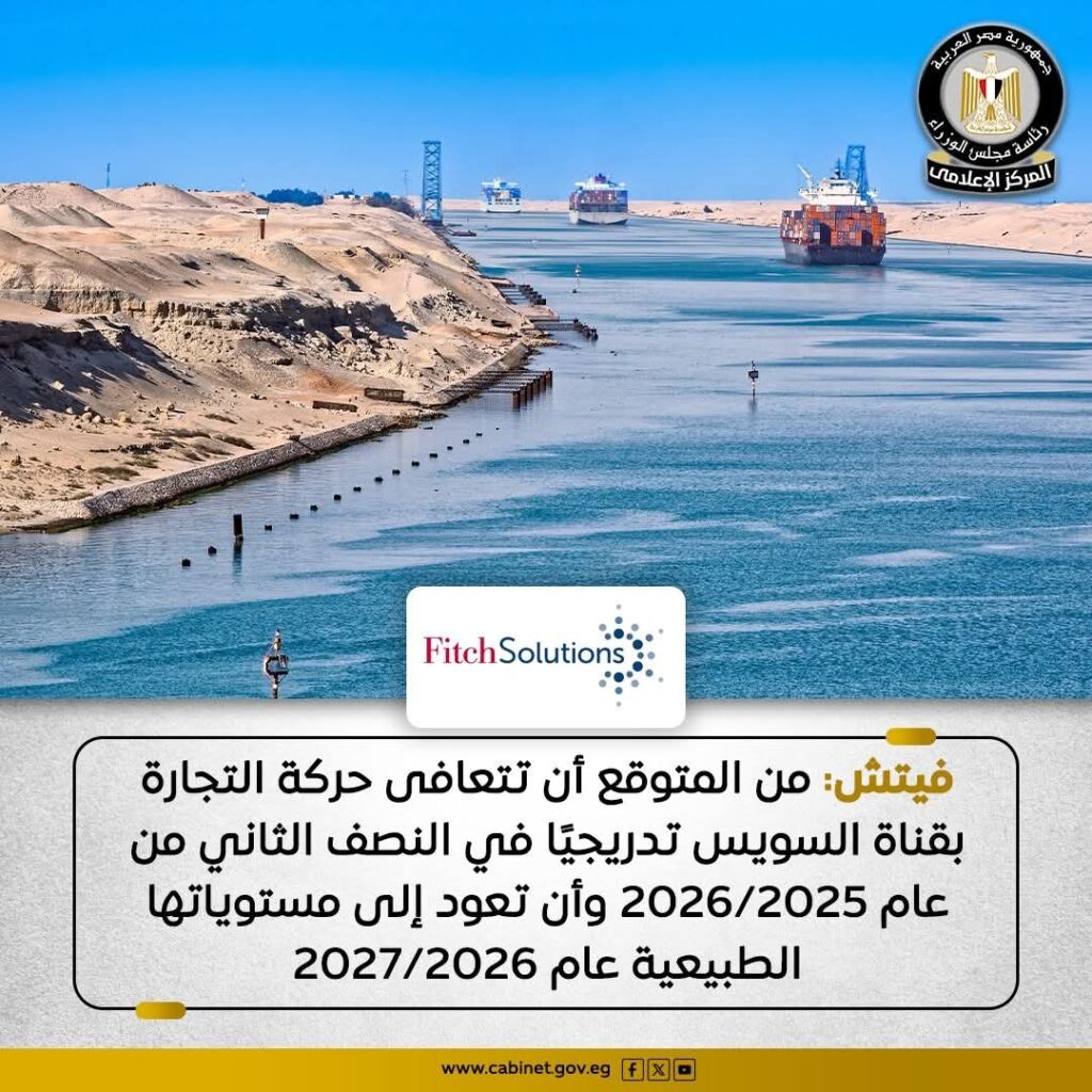 أكدت وكالة “فيتش” أن حركة التجارة بقناة السويس ستشهد تعافيًا تدريجيًا في النصف الثاني من عام 2025/2026 بعد وقف إطلاق النار في غزة، وتوقعت عودة حركة السفن بالقناة إلى مستويات ما قبل الحرب خلال عام 2026/2027.