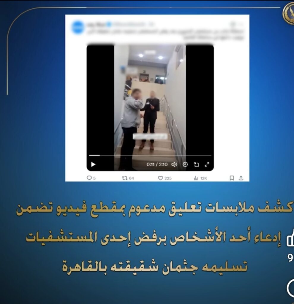في إطار جهود وزارة الداخلية لكشف ملابسات ما تم تداوله عبر مواقع التواصل الاجتماعي من تعليق مدعوم بمقطع فيديو، تضمن ادعاء أحد الأشخاص رفض إحدى المستشفيات بالقاهرة تسليمه جثمان شقيقته، فقد أسفرت الفحوصات عن عدم صحة تلك الادعاءات.