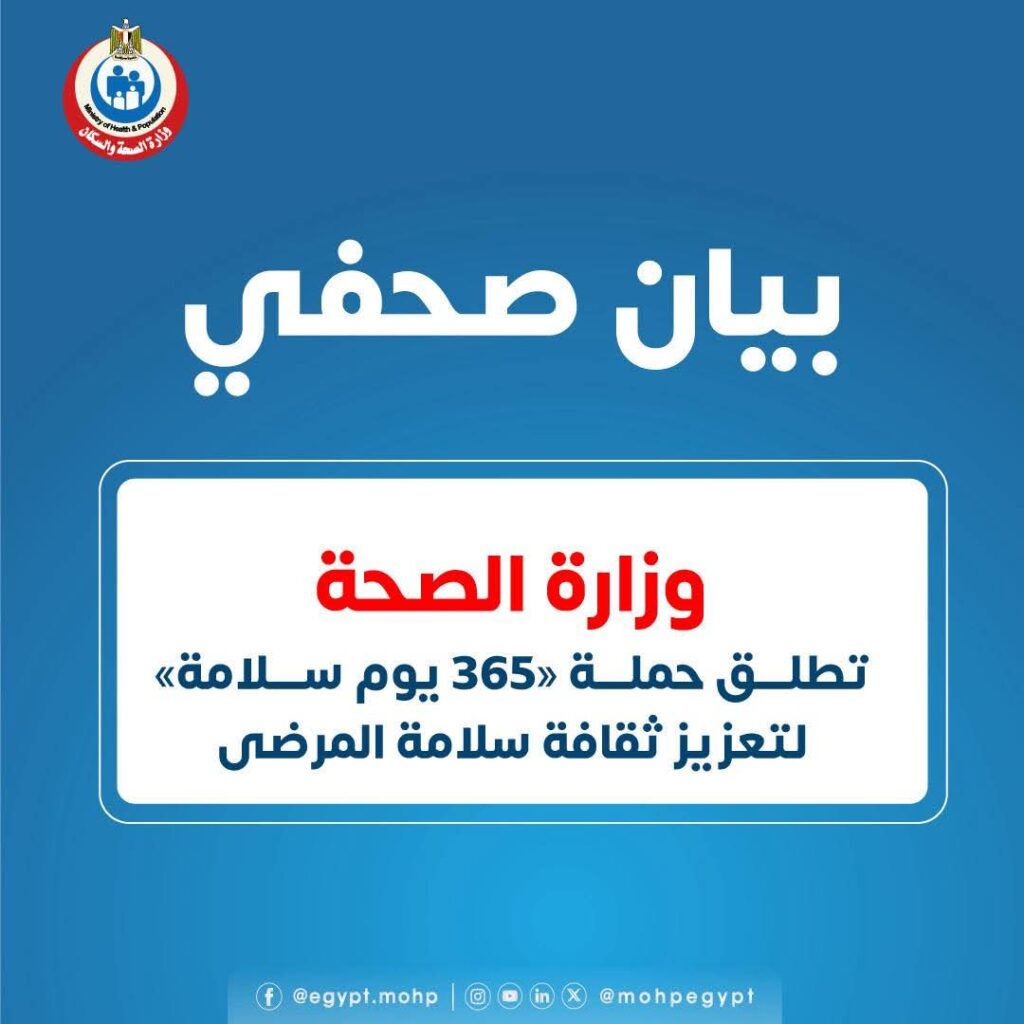 أعلنت وزارة الصحة والسكان إطلاق حملة التوعية القومية «365 يوم سلامة» تحت شعار «اسأل.. شارك.. تأكد.. من أجل سلامتك»، من خلال الإدارة العامة لسلامة المرضى التابعة للإدارة المركزية لجودة الرعاية الصحية، كمحور رئيسي ضمن برنامج إشراك وتوعية المرضى وذويهم، في إطار حرص الوزارة على رفع جودة الرعاية الصحية وتعزيز مفاهيم الأمان داخل المنشآت الطبية.
