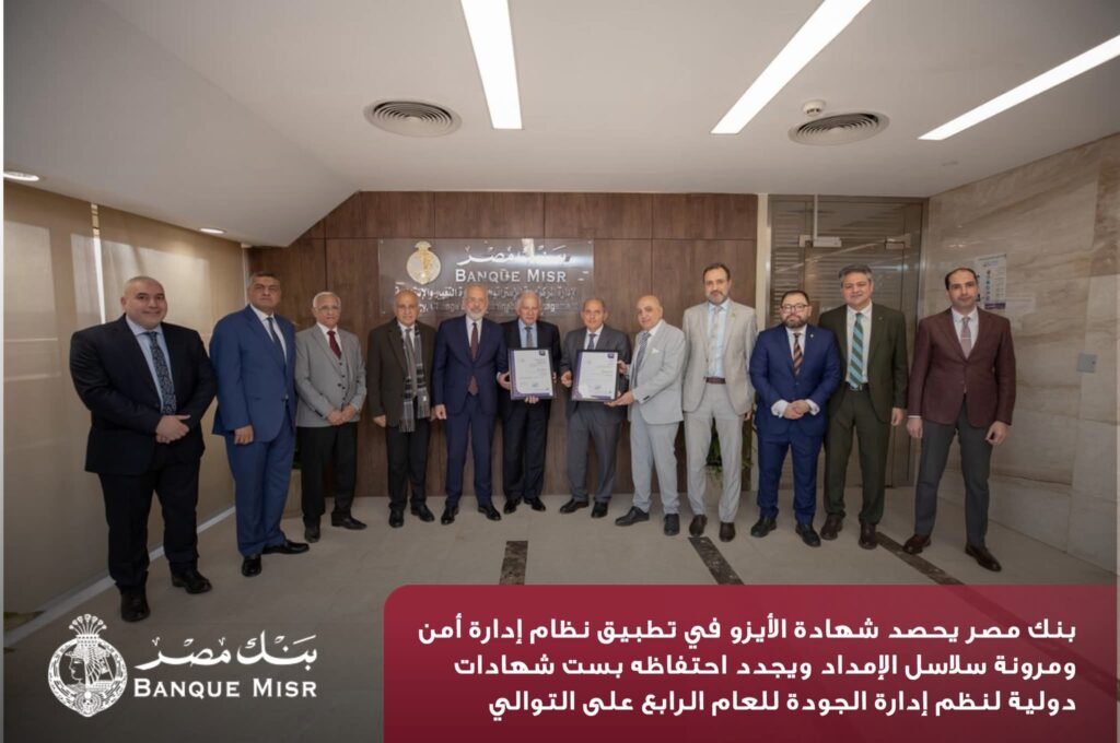 بنك مصر يحصد شهادة الأيزو في تطبيق نظام إدارة أمن ومرونة سلاسل الإمداد ويجدد احتفاظه بست شهادات دولية لنظم إدارة الجودة للعام الرابع على التوالي.