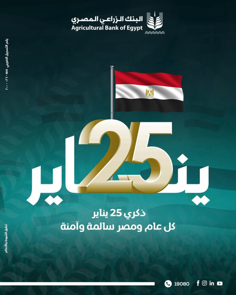 بمناسبة ذكرى ثورة 25 يناير وعيد الشرطة المصرية، يتقدم البنك الزراعي المصري بخالص التهنئة إلى فخامة السيد الرئيس عبد الفتاح السيسي، وإلى شعب مصر العظيم، وإلى رجال الشرطة البواسل، تقديرًا لدورهم الوطني في حماية أمن واستقرار الوطن.