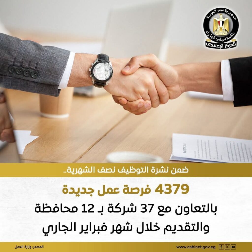 ضمن نشرة التوظيف نصف الشهرية ٤٣٧٩ فرصة عمل جديدة بالتعاون مع ٣٧ شركة ب ١٢ محافظة و التقديم خلال شهر فبراير الجاري .