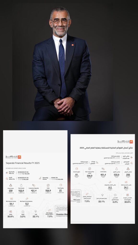 نتائج أعمال بنك القاهرة بنهاية العام المالي 2025.. ارتفاع صافي الربح بنسبة 30% ليصل إلي 16.1 مليار جنيه مصري، ونمو إيرادات التشغيل بنسبة 20% لتصل إلي 41.5 مليار جنيه مصري.