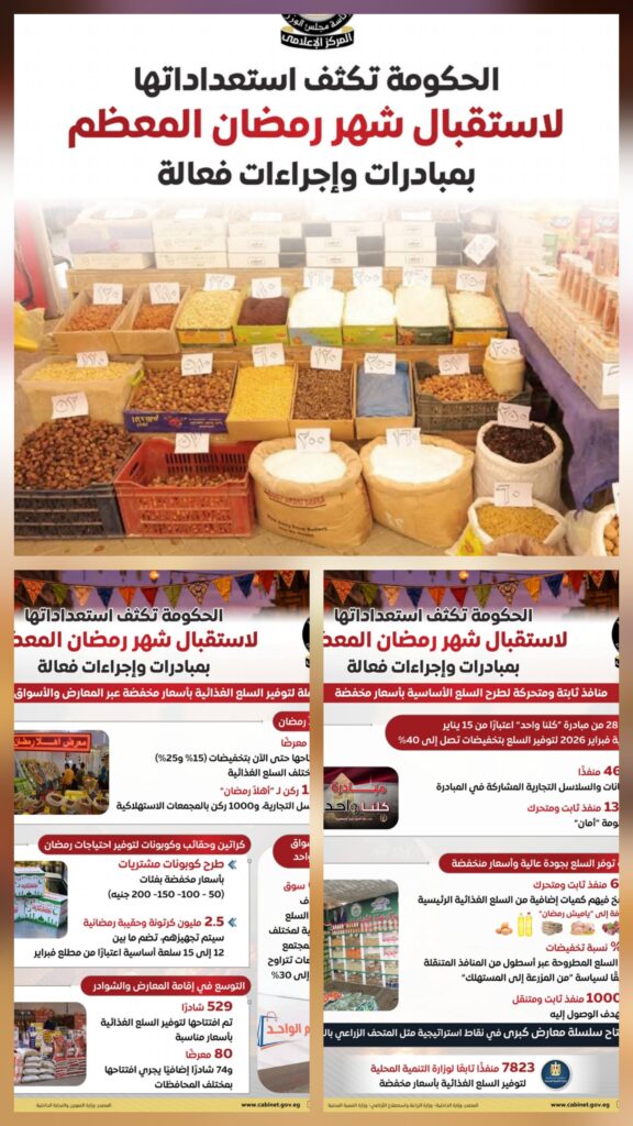 المركز الإعلامي لمجلس الوزراء: الحكومة تكثف استعداداتها لاستقبال شهر رمضان المعظم – افتتاح 360 معرض “أهلًا رمضان” و600 سوق يوم واحد لتوفير السلع بأسعار مخفضة قبل رمضان.