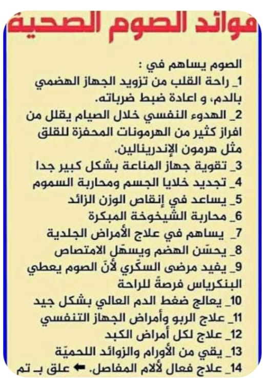 🟩 الصوم والصحة: الصيام يحقق فوائد صحية، منها تحسين أداء الكبد والمعدة، وعلاج أمراض النقرص، والوقاية من جلطات الدم.