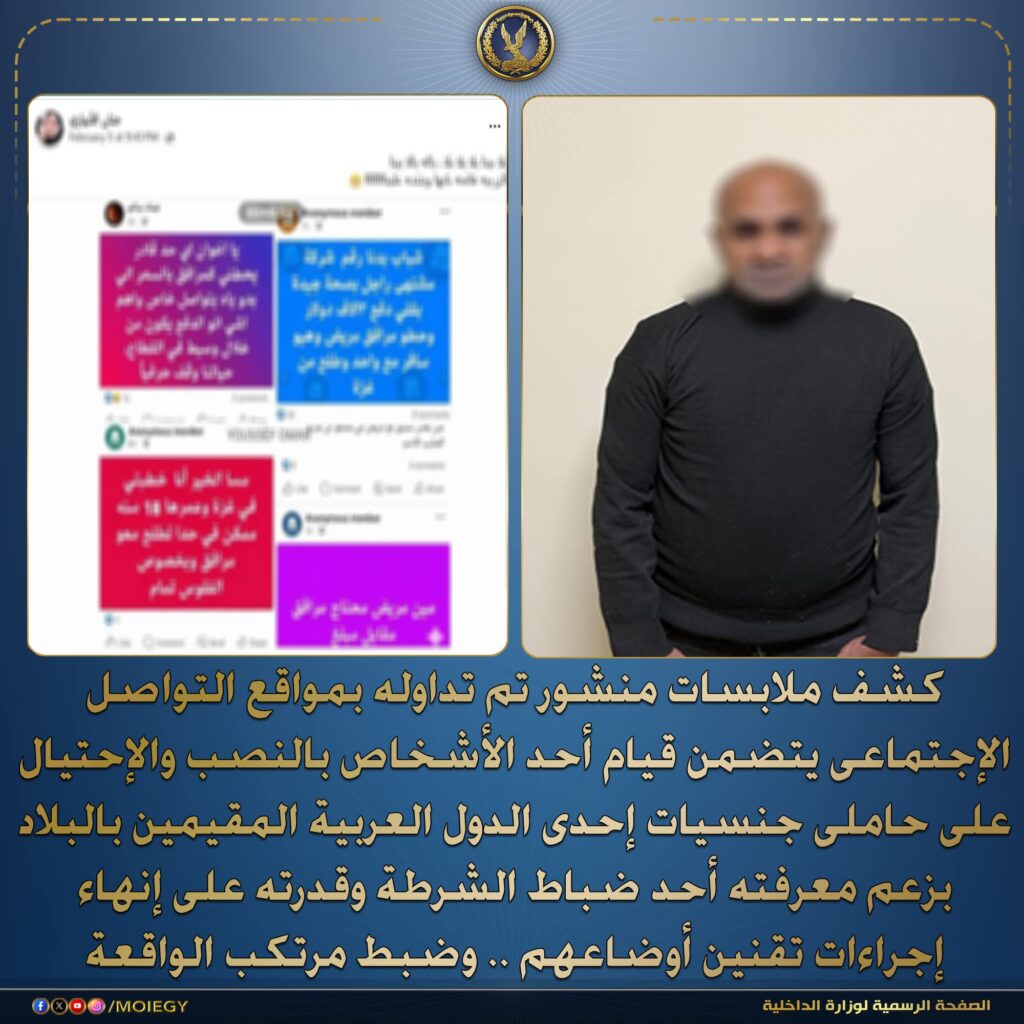 تمكنت وزارة الداخلية المصرية من كشف ملابسات منشور تم تداوله عبر مواقع التواصل الاجتماعي، تضمن اتهام أحد الأشخاص بالنصب والاحتيال على عدد من حاملي جنسيات إحدى الدول العربية المقيمين داخل البلاد، بزعم علاقته بأحد ضباط الشرطة وقدرته على إنهاء إجراءات تقنين أوضاعهم.